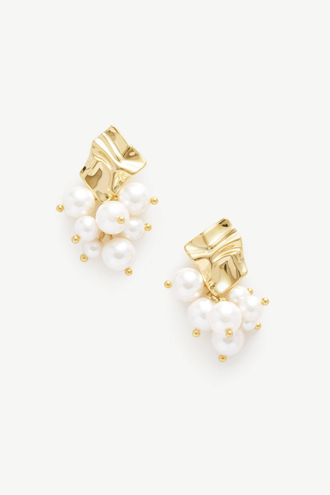 These earrings blend modern design with classic elegance. Crafted from brass and finished with 18K gold plating, they feature a sculptural, folded - metal top piece. Below, a cluster of luminous imitation pearls, accented with tiny gold beads, creates a soft, romantic cascade. Perfect for adding a touch of refined glamour to both day and evening looks, they effortlessly combine contemporary style with timeless pearl charm.