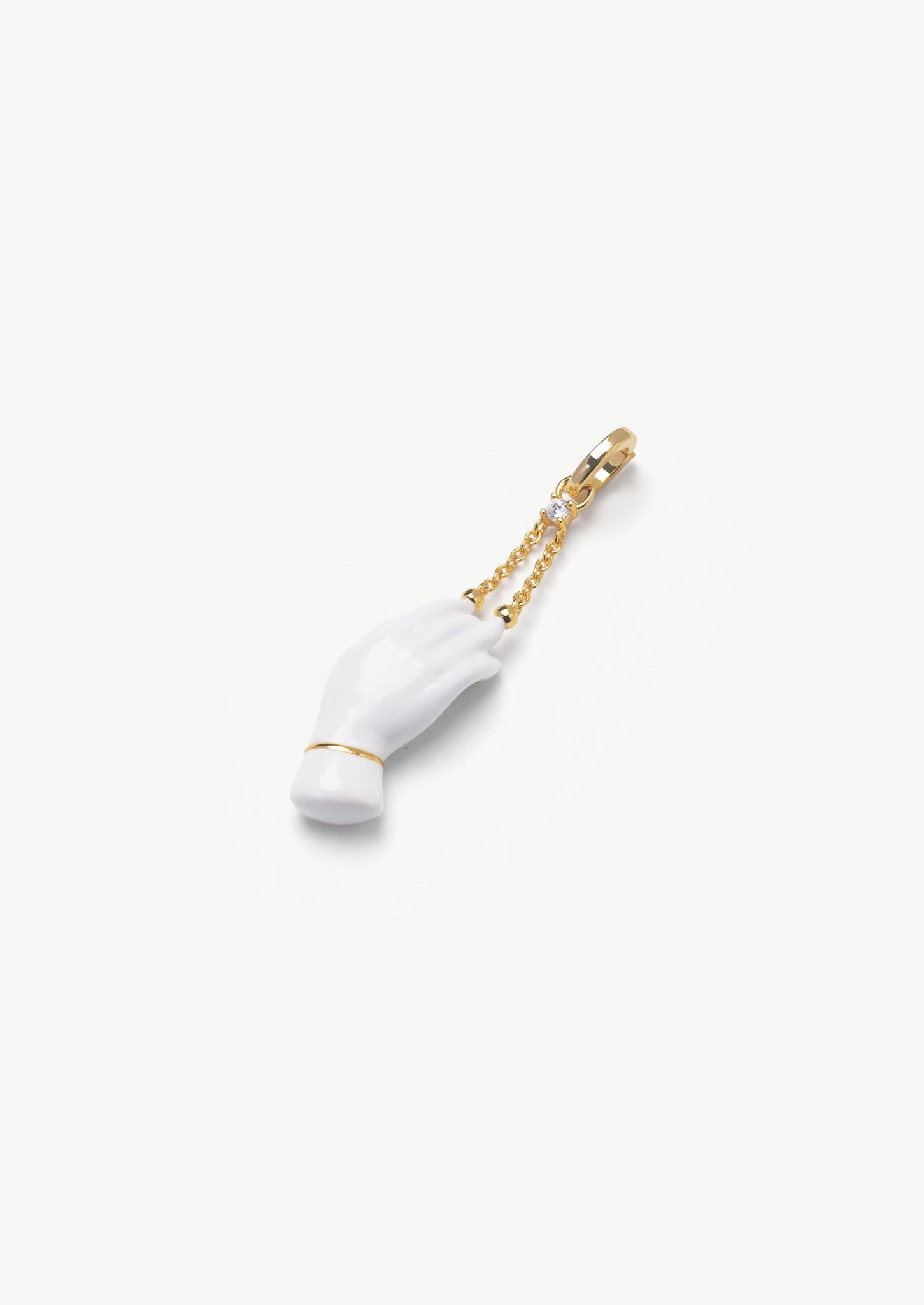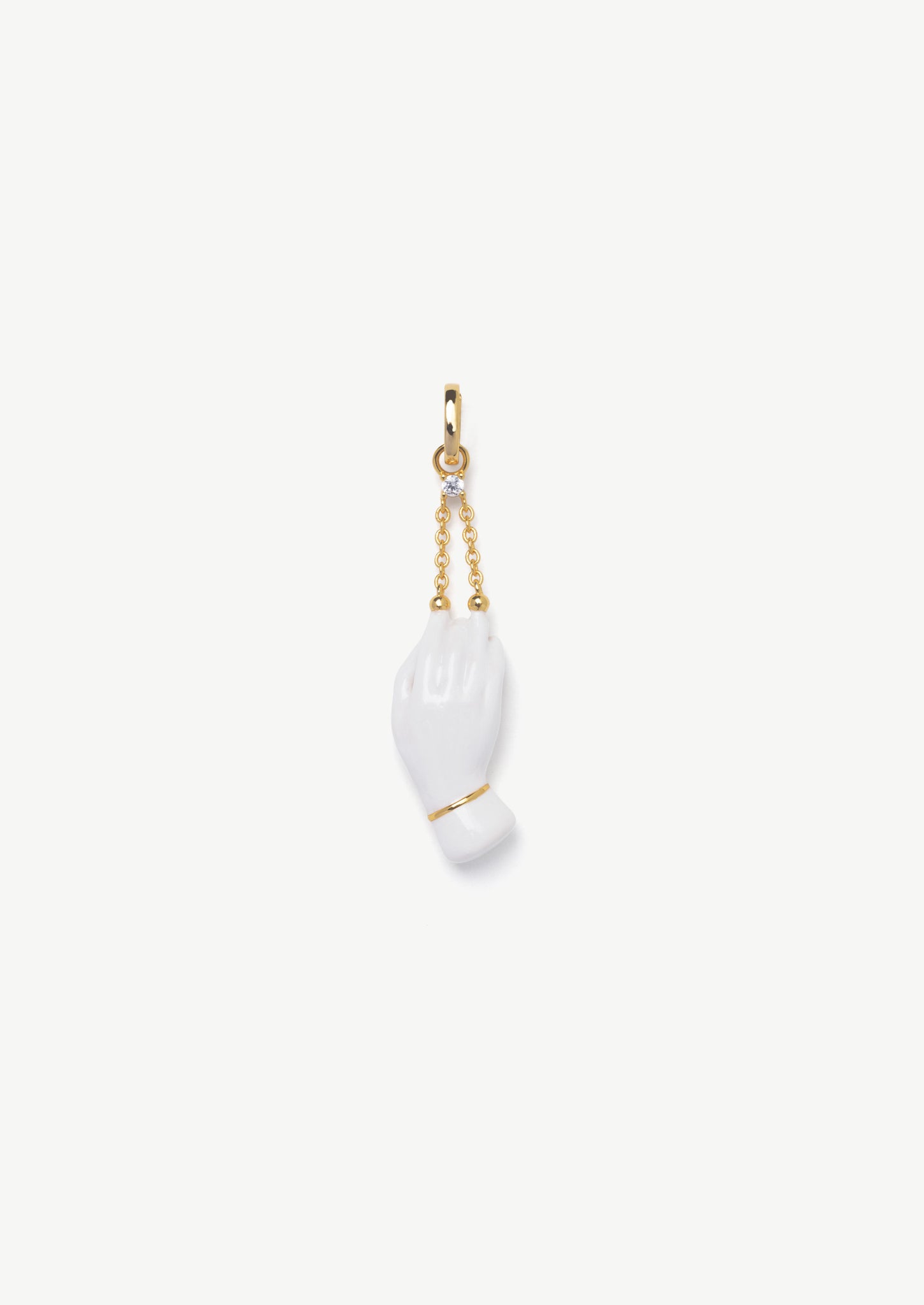 The hand is rendered in a smooth, white finish, creating a striking contrast with the golden chain and the gold - plated bail at the top.